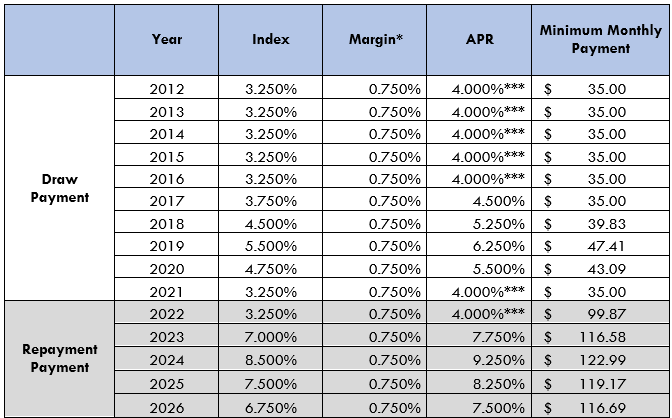 Historical Example: The following table shows how the annual percentage rate and the minimum monthly payments for a single $10,000 credit advance would have changed based on the changes in the index over the past 15 years. The index values are from January 1st of each year. While only one payment amount per year is shown, payments could have varied during each year of the draw period and the repayment period. The table assumes that no additional credit advances were taken, that only the minimum payments were made each month, and that the rate remained constant during each year. The table does not necessarily indicate how the index or your payments will change in the future.